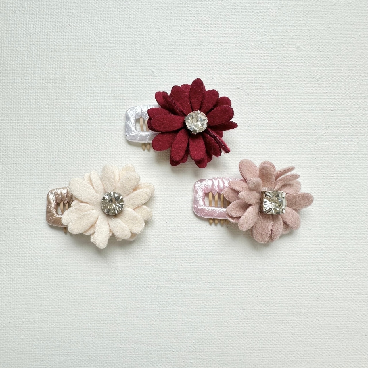 花の中心には小さなアクセントを加え、控えめなくすみカラーがナチュラルなお洋服にもぴったり馴染みます。